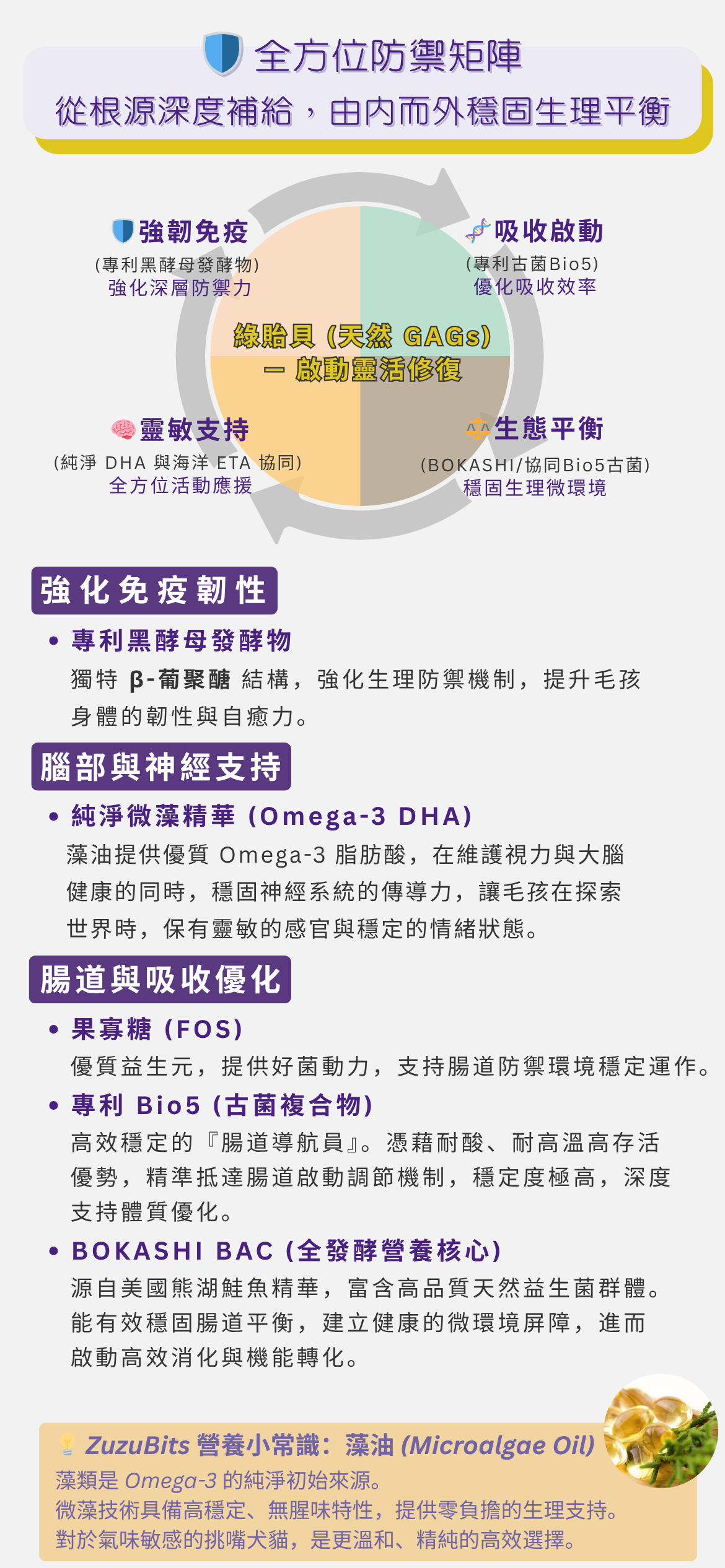 • 日常守護:適合日常保養,也能作為熟齡犬貓的行動輔助營養補給。