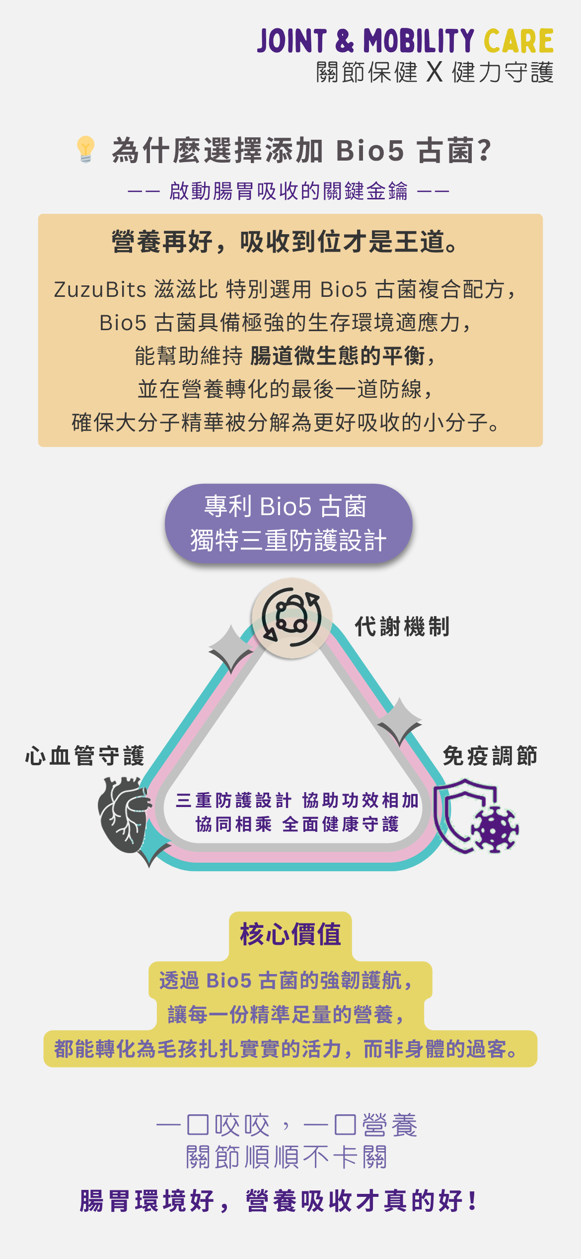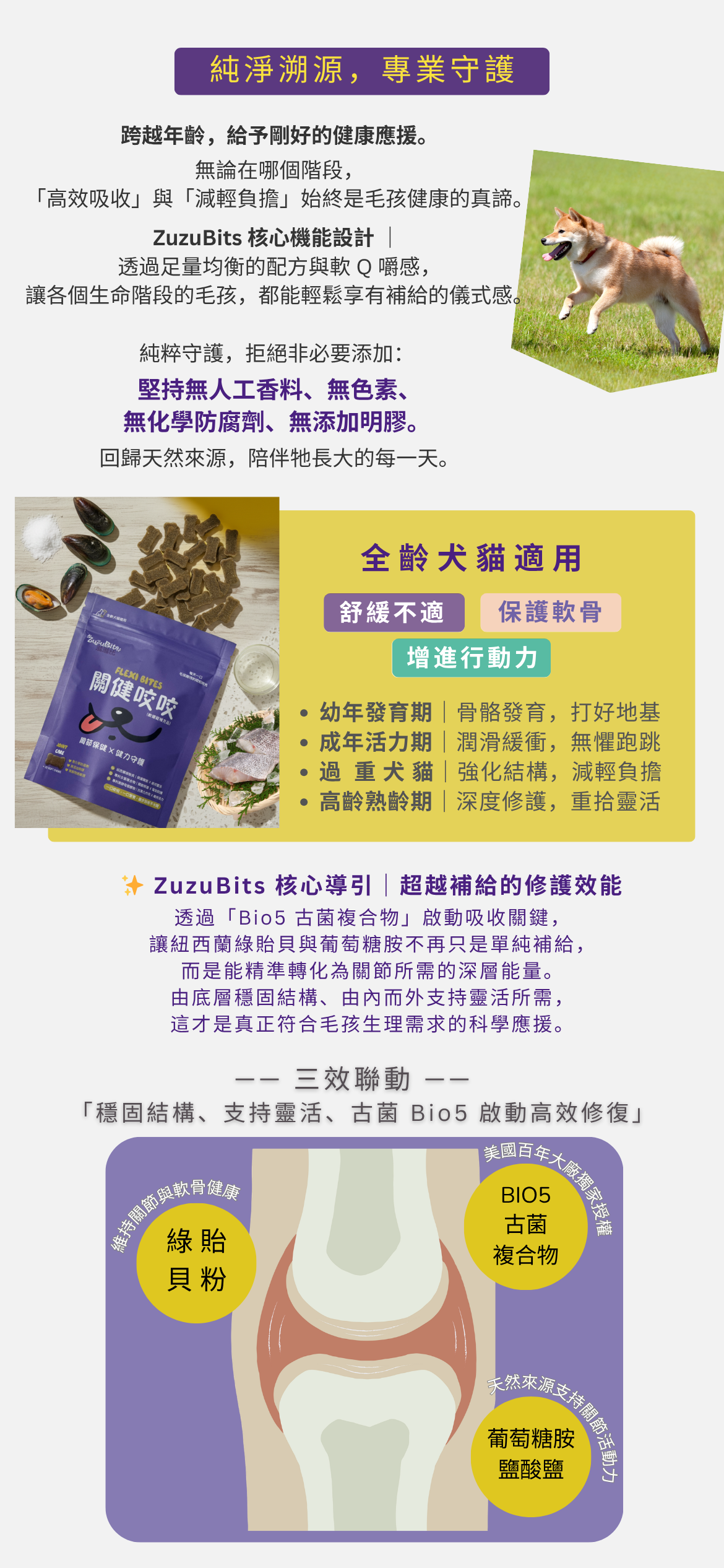 專為犬貓關節保健設計,嚴選天然綠貽貝、葡萄糖胺鹽酸鹽與透明質酸,搭配魚肉蛋白、專利古菌複合物、全發酵營養粉與專利黑酵母發酵物,讓毛孩補充關鍵營養,同時兼顧好口感與腸道健康。