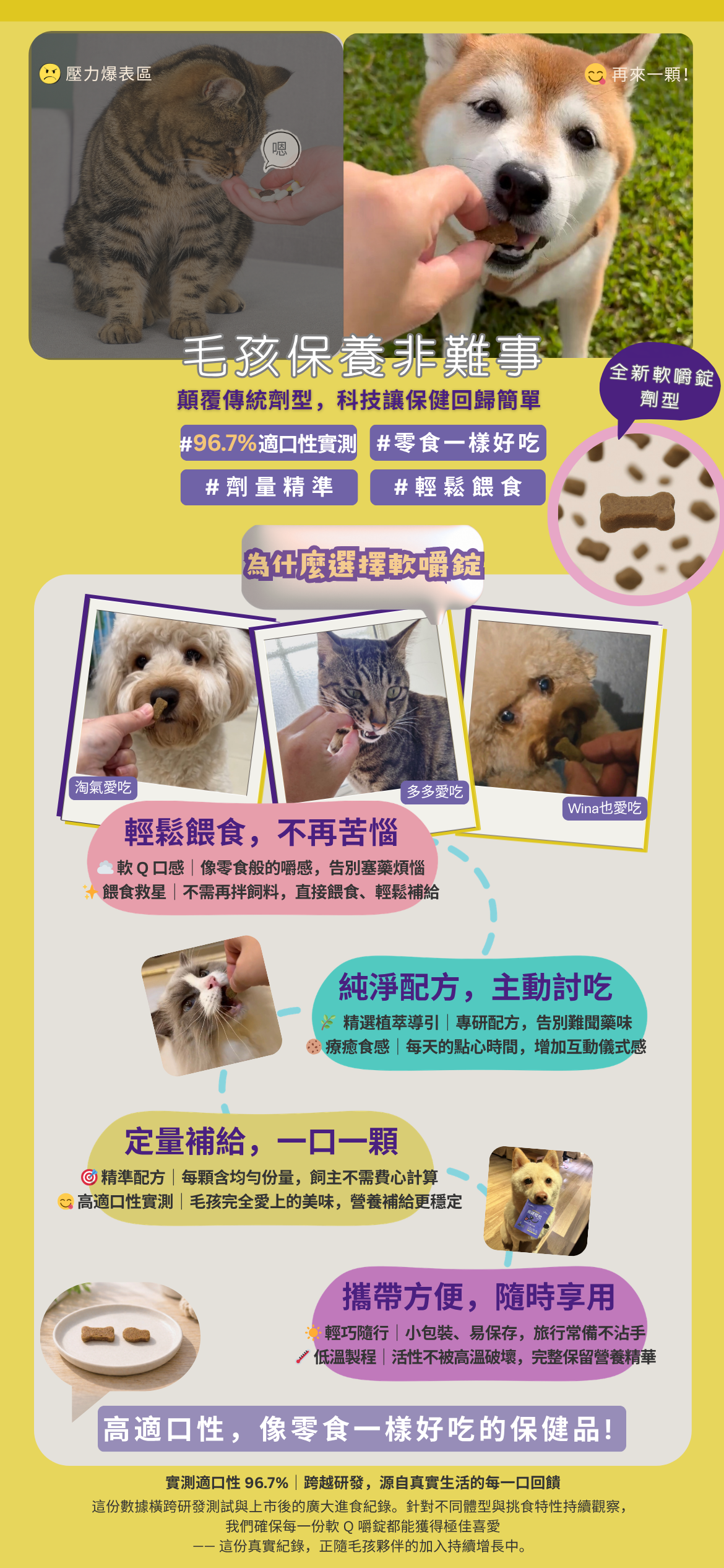 • 軟嚼錠劑型:毛孩易接受,好餵食不挑嘴;增加日常互動陪伴時光。